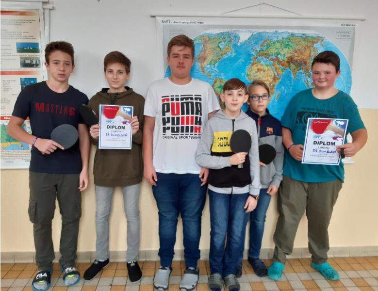 Ve středu 20.listopadu se konalo v Záboří okresní kolo základních škol ve stolním tenise. Za naši školu se ho zúčastnila družstva starších a mladších žáků. Za mladší žáky nás reprezentovali Marek Sokol ze 6.M, Alex Harant ze 7.C a Lukáš Pojsl z 5.B. V této kategorii bylo 7 škol ze strakonického okresu a naše družstvo obsadilo krásné 2. místo za ZŠ F.L.Čelakovského Strakonice. V kategorii starších žáků soutěžilo 6 škol a naše družstvo ve složení Adam Svoboda z 9.A, Samuel Drančák a Jiří Tomášek z 8.A obsadilo rovněž výborné 2.místo za ZŠ Poděbradova Strakonice. Děkuji všem našim hráčům za úspěšnou reprezentaci naší školy.